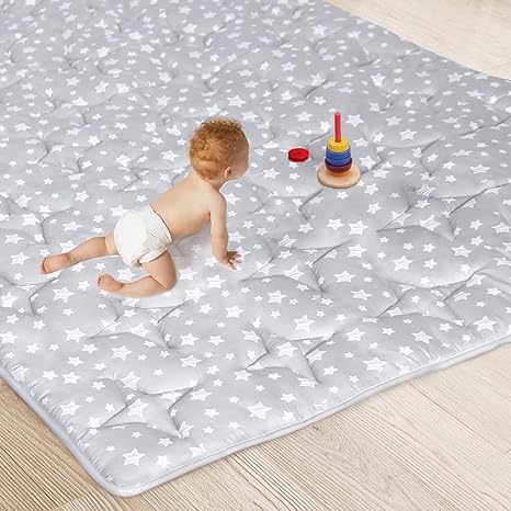 Baby Play Mat | Playpen Mat - 72" x 59", Large Padded Tummy Time Activity Mat for Infant & Toddler, Quilted with Four-Leaf Clover, Grey Star