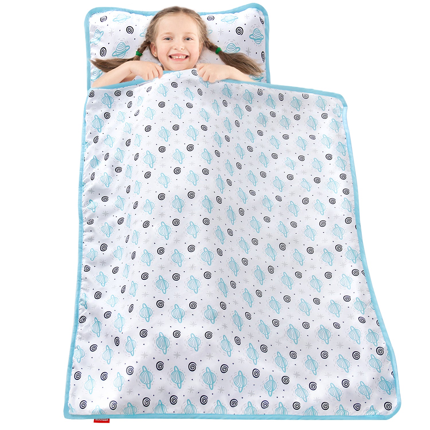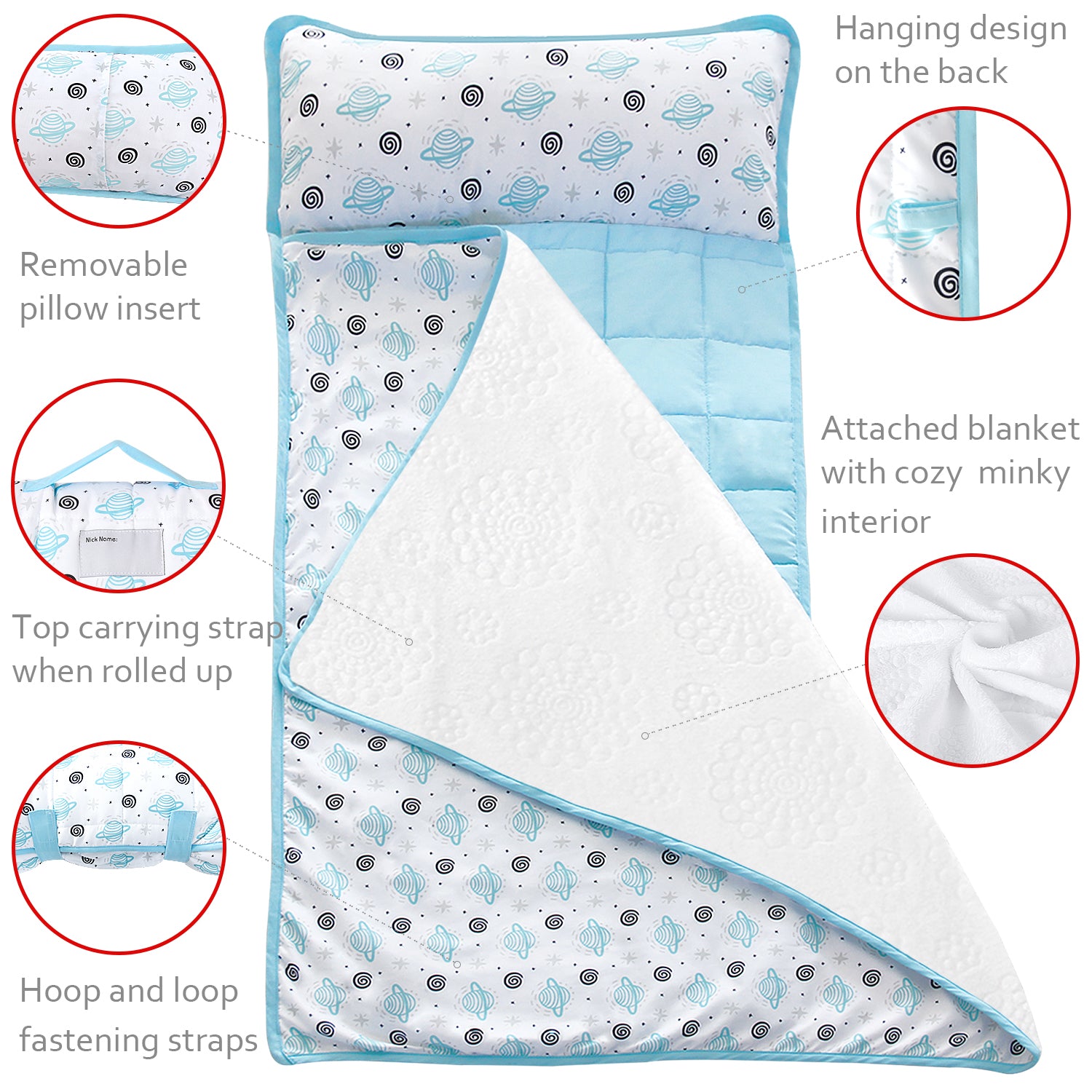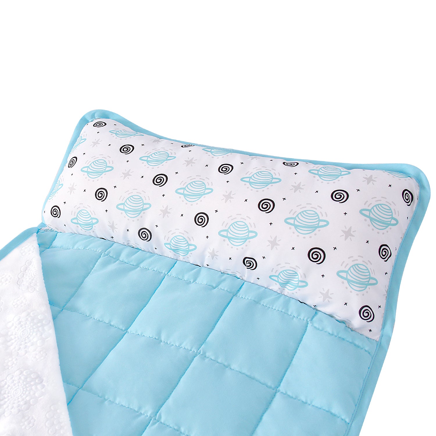 Toddler Nap Mat- Removable Pillow and Fleece Minky Blanket, 21" x 50", Planet